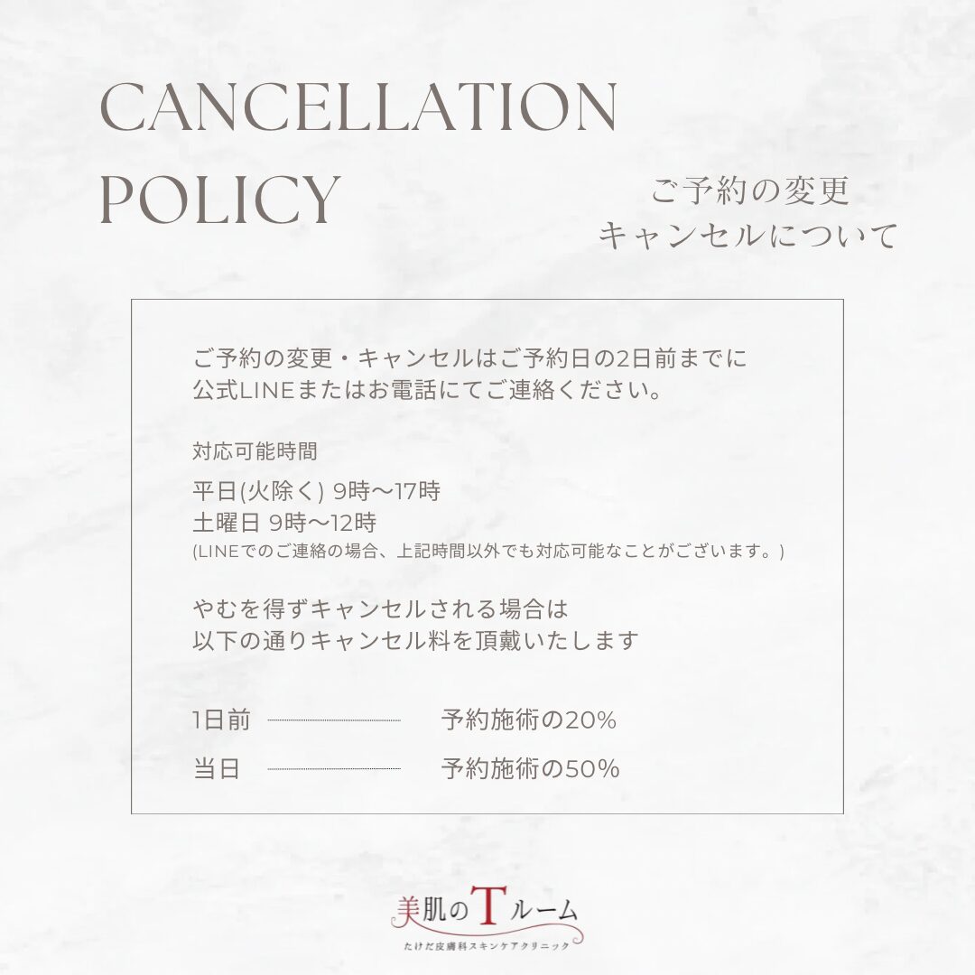 いつも たけだ皮膚科スキンケアクリニック「美肌のTルーム」 をご利用いただき、誠にありがとうございます。 このたび当院では、より多くの皆さまに安心してご予約いただけるよう、 2025年11月よりご予約の変更・キャンセルに関する規定を一部変更させていただくことになりました。 ■ ご予約の変更・キャンセルについて ご変更やキャンセルのご連絡は、 ご予約日の 2日前まで に 公式LINEまたはお電話 にてお願いいたします。 対応時間:平日(火曜を除く)9:00~17:00 / 土曜 9:00~12:00 ※LINEでのご連絡は、上記時間外でも対応できる場合がございます。 ■ キャンセル料について やむを得ずキャンセルされる場合は、下記の通りキャンセル料をお願いしております。 1日前 予約施術料金の 20% 当日 予約施術料金の 50% 皆さまに気持ちよく通っていただけるクリニックを目指し、 今後もより良いサービスのご提供に努めてまいります。 何卒ご理解とご協力のほど、よろしくお願い申し上げます。