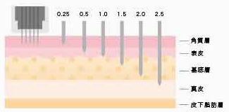 また、ダーマペンの最大の利点は針の深達度(深さ)を自在に変えることが出来るので、穿刺する傷の深さを肌タイプや症状に合わせて、調整することが可能です。